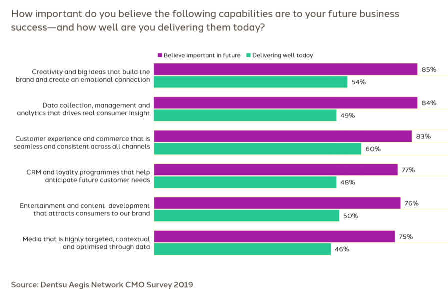 В исследовании подчеркивается, что на рынке есть разрыв между текущими возможностями компаний и факторами, которые смогут обеспечить успешные маркетинговые кампании в дальнейшем. В первую очередь это касается работы с данными — 84% опрошенных считают эту область заделом на будущее, но только 49% уверены в своих возможностях сейчас. 83% маркетологов заявили, что важно отслеживать покупательское поведение клиентов и взаимодействовать с ними через различные каналы, а 60% считают, что справляются с этой задачей сегодня.