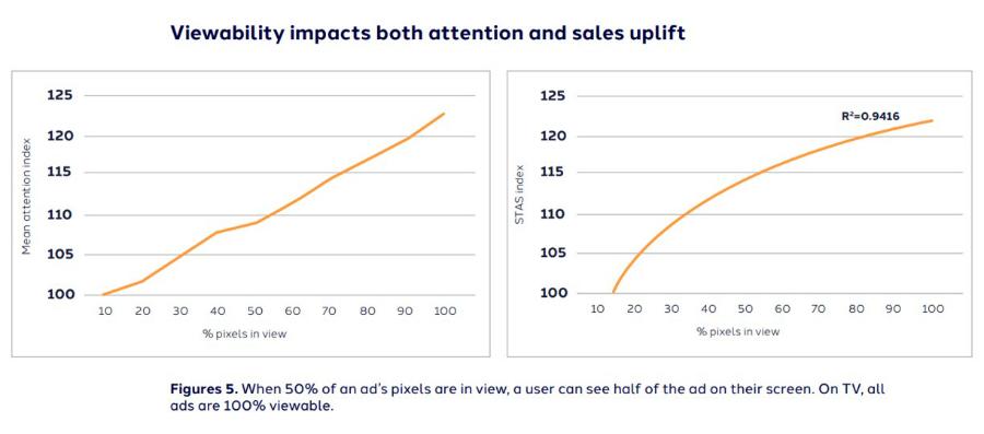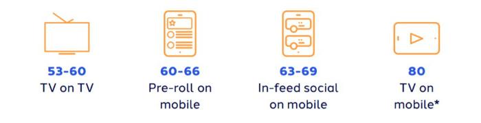 2. Уровень внимания к видеорекламе зависит от платформы. Максимальное воздействие на аудиторию по-прежнему обеспечивают телевизионные ролики. На цифровых платформах существенное воздействие на внимание к рекламе и индекс краткосросрочного влияния (STAS) оказывает процент видимой части рекламного ролика (viewability index). Эксперты пришли к выводу, что необходимо повысить стандарт видимости с 50% до 100% пикселей.