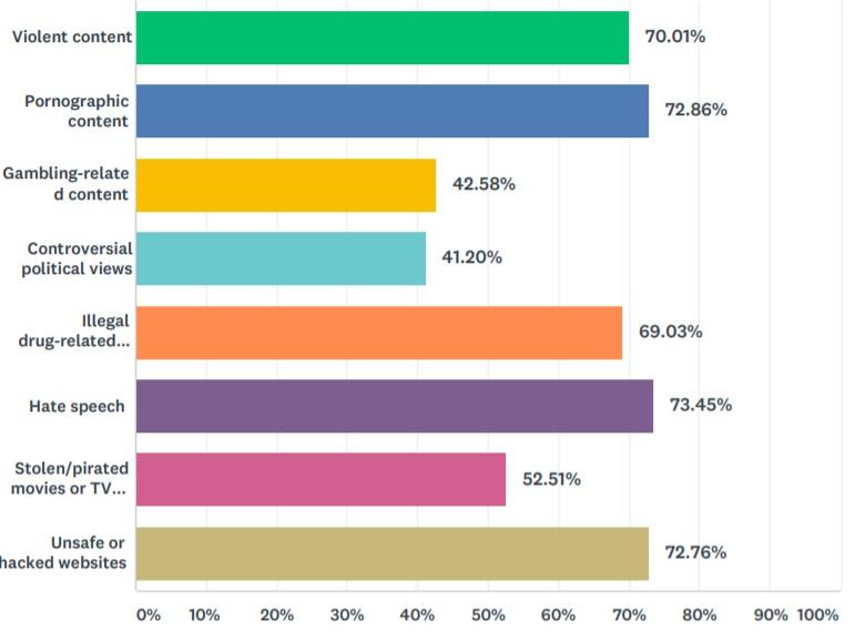 - Большинство опрошенных считают, что рекламодатели должны предотвращать появление своих объявлений рядом с контентом, разжигающим ненависть (73%), содержащим порнографию (73%), сцены насилия (70%) и незаконное употребление наркотиков (69%).
