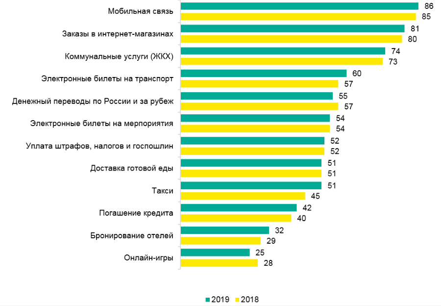 Самыми популярными направлениями онлайн-платежей остаются услуги мобильной связи — таким способом за них платят 86% россиян, заказы в интернет-магазинах — 81% и коммунальные услуги — 74%. В 2019 г. жители крупных российских городов стали чаще платить онлайн за такси, электронные билеты на транспорт и бронь отелей. Доля пользователей, которые совершали денежные переводы через интернет и платили за онлайн-игры, снизилась.