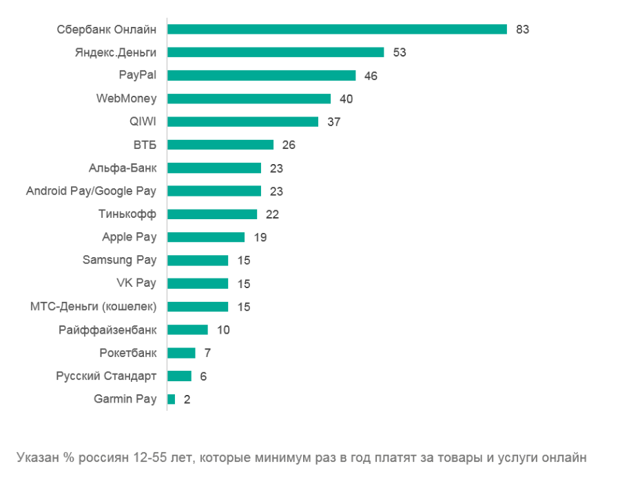 Лидерство среди платежных сервисов в России со значительным отрывом удерживает Сбербанк Онлайн — им пользуются 83% респондентов. На втором месте находятся «Яндекс.Деньги» (53%), на третьем — PayPal (46%). Среди бесконтактных систем платежей самая большая аудитория плательщиков у Google Pay — 23% россиян. С помощью Apple Pay онлайн-платежи совершали 19% опрошенных, с помощью Samsung Pay — 15%.