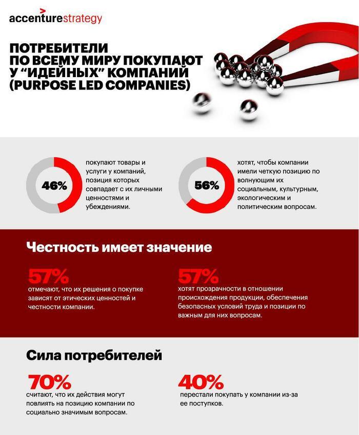 Около половины (46%) российских потребителей и 63% покупателей по всему миру чаще приобретают продукцию корпораций, чья позиция по социально значимым вопросам совпадает с их ценностями. Об этом говорится в исследовании консалтинговой компании Accenture. Опрос проводился в 35 странах, включая Россию, США, Великобританию и Китай.