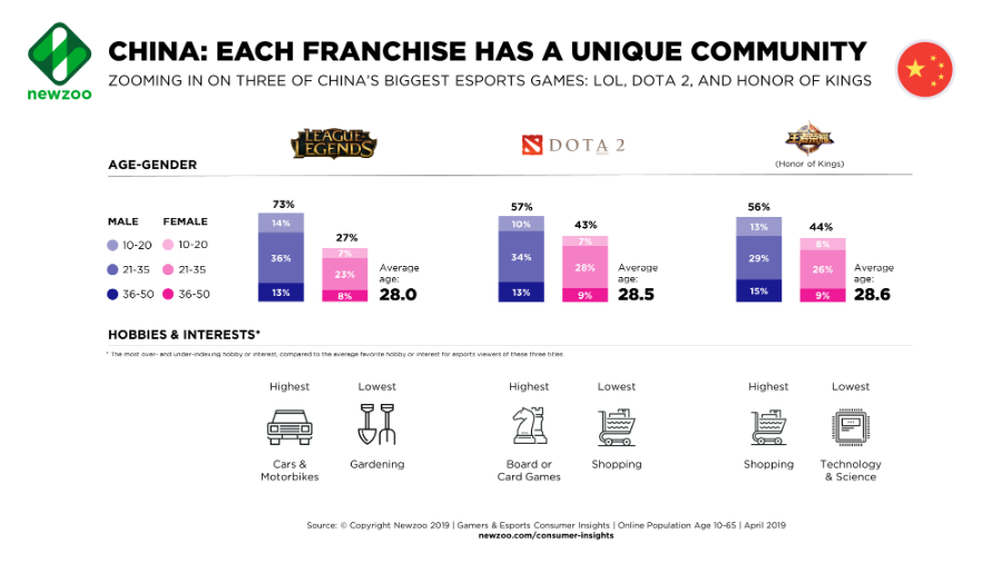 NewZoo провела анализ социо-демографических характеристик поклонников игр Leagues of Legends, Dota 2 и Honor of Kings на китайском рынке. Средний возраст вовлеченной аудитории — около 28 лет для всех франшиз, однако гендерное соотношение фанатов различается. Например, в League of Legends самый сильный разрыв между долей женщин (27%) и мужчин (73%). При этом в Honor of Kings фанатов мужского пола 56%, тогда как 44% составляют женщины.