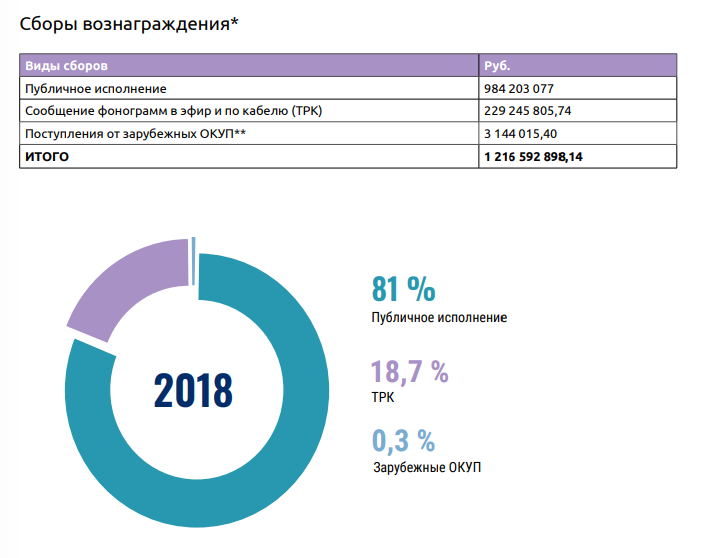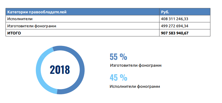 Из этой суммы на выплаты правообладателям пришлось 907,5 млн руб., что на 16% больше, чем в 2017 г. Из них: исполнителям — 408,3 млн, изготовителям фонограмм — 499,2 млн руб.