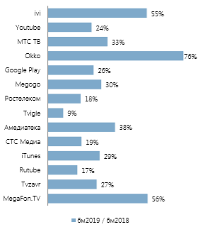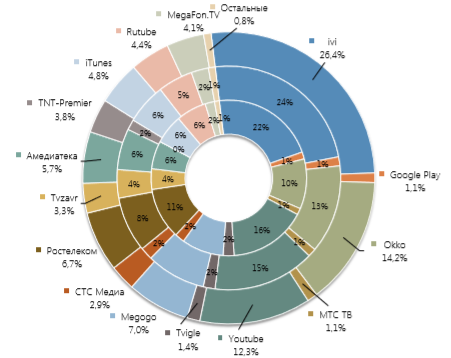 - Крупнейшими онлайн-видеосервисами на российском рынке по итогам полугодия стали ivi, Okko и YouTube с долями 26,4%, 14,2% и 12,3% соответственно. Максимальный рост выручки за отчетный период — у Okko (76%), МегаФон ТВ (56%), ivi (55%). Наименьшие — Tvigle (9%).