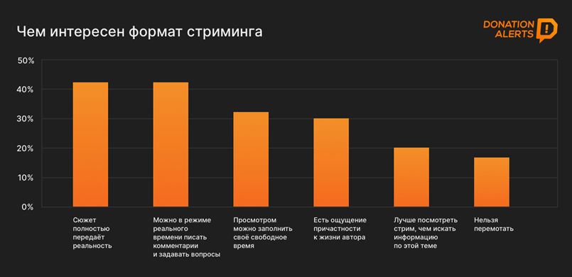 DonationAlerts и ResearchMe провели исследование и выяснили, что практически каждый второй пользователь рунета смотрит стримы. Таких оказалось около 44%.