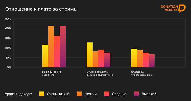 В монетизации своих видео не видят ничего зазорного 42% опрошенных с доходом выше среднего и 23% с низкой прибылью. Стыдятся своего заработка только 26% стримеров с низким доходом и 15% с высоким.