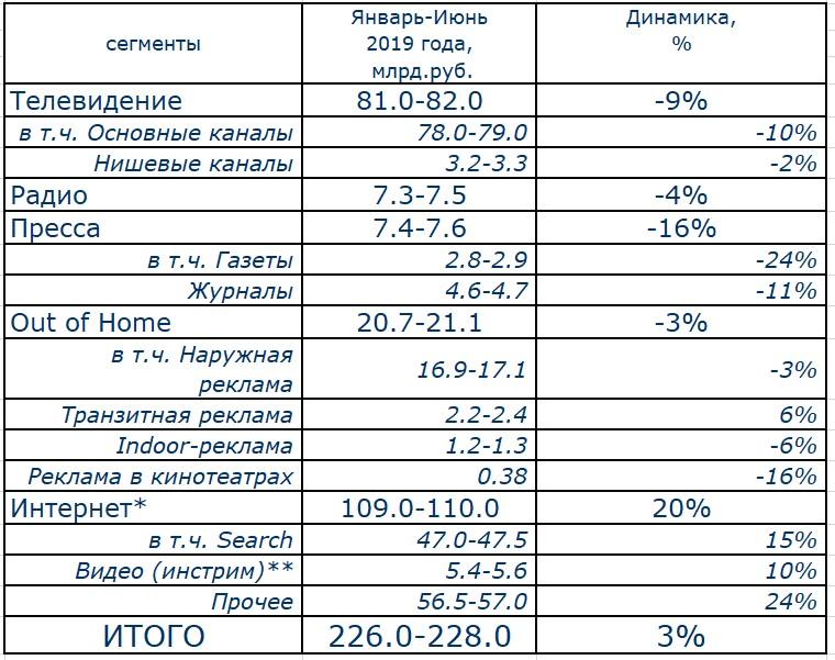 Рост российского рекламного рынка по итогам первой половины 2019 г. замедлился год к году в четыре раза и составил 3%. В денежном выражении расходы рекламодателей достигли 226–228 млрд руб., по оценке Ассоциации коммуникационных агентств России.