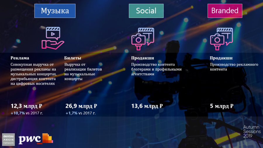 Выручка от дистрибуции музыкального контента, включающая доходы от реализации билетов на концерты и от продаж рекламы на концертах, составила 39,2 млрд руб. Это больше показателя 2017 г. на 12,4%. Затраты на создание контента блогерами и профильными агентствами для социальных сетей в 2018 году составили 13,6 млрд руб. А объем производства видеопродакшена для брендов находится на уровне 5 млрд руб.