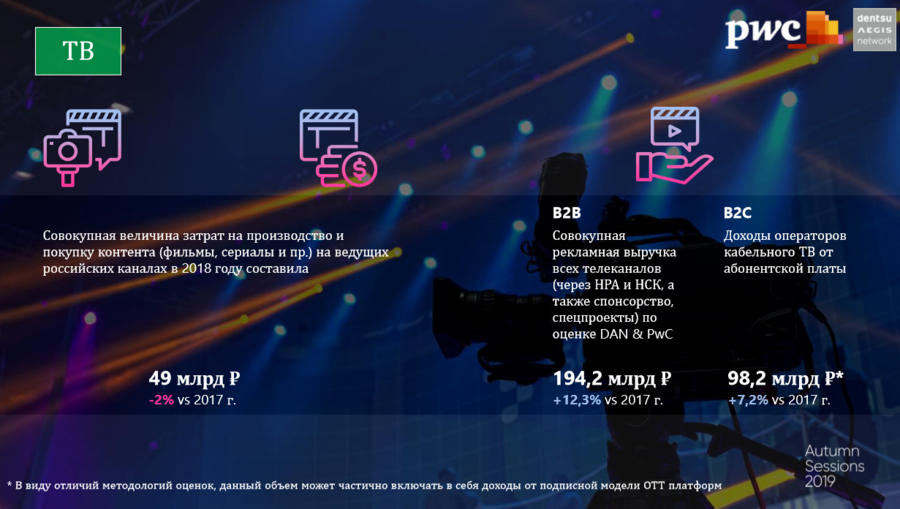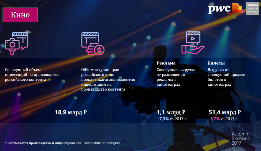 PWC и Dentsu Aegis Network Russia оценили объем рынка производства и покупки контента. Самыми крупными сегментами оказались телевидение и кинопрокат