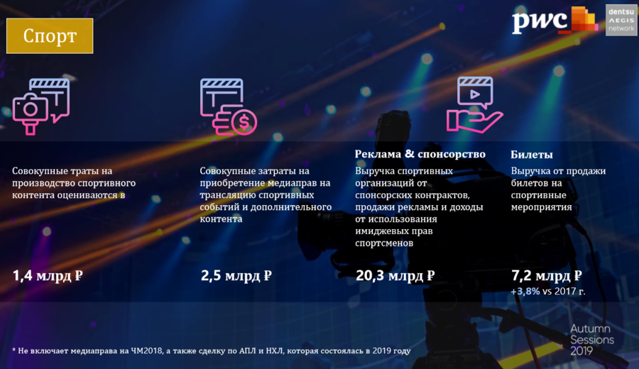 Сегмент спортивного контента потратил 3,9 млрд руб. на производство контента и приобретение прав на трансляцию спортивных событий. Дистрибуция, которая включает выручку от спонсорства, прямой рекламы, а также продажи билетов, составила 27,5 млрд.