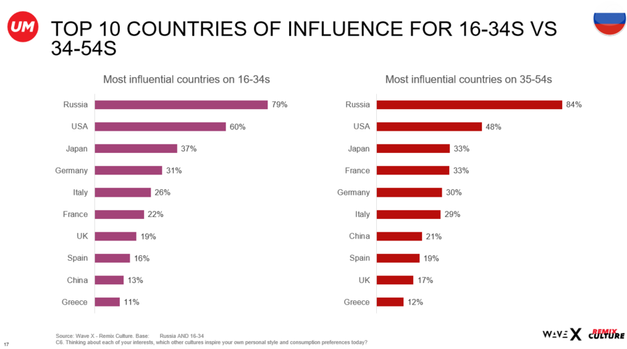 - Современный потребитель стремится апеллировать к чувству индивидуальности через местный контент и локальную культуру. Около 45% россиян считают, что продукция и контент других стран более аутентичны. В мире показатель выше — 57%. Основными странами, чья культура повлияла на взгляды респондентов из России, названы США и Япония. Третьей такой страной для потребителей до 34 лет стала Германия, а для более старшей аудитории — Франция.