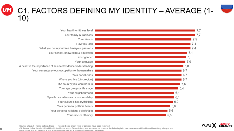 - Все больше людей пытаются расширять свою индивидуальность и отдают предпочтение брендам, которые это поощряют. Более половины российских респондентов — 58% — заинтересованы в сотрудничестве с компаниями, которые используют в своей работе новаторский подход и взывают к проявлению различных граней личности потребителя. По миру этот показатель немного выше — 65%. Главным фактором, который сформировал их индивидуальность, 64% опрошенных россиян назвали состояние здоровья, семью и традиции — 62%, друзей — 57%. В топ-5 факторов вошли также внешность и занятия в свободное время.