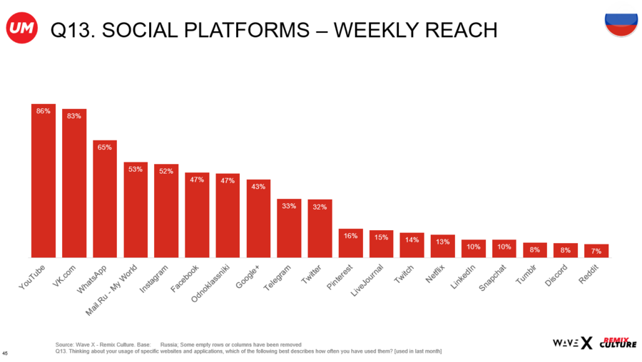 Медиаагентство UM (входит в рекламную группу АДВ) провело исследование Remix Culture среди онлайн-пользователей в 81 стране и выявило основные тенденции, которые формируют потребительское поведение: готовность к протесту, любовь к ретро, симпатия к локальной культуре и проявление индивидуальности. Так, более половины опрошенных россиян признались в любви к музыке и кино прошлых десятилетий, а также к брендам, которые используют новаторский подход в своей деятельности.