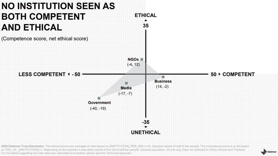 - Россия является последней среди 26 стран по совокупному уровню доверия к медиа, государству, бизнесу и негосударственным организациям. Опрос Edelman показал, что индекс доверия к этим четырем институтам вырос за год на один пункт — до 30, в то время как максимальный балл для «недоверия» составляет 49 пунктов.