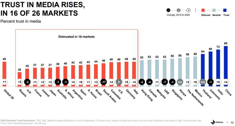 На глобальном рынке Россия является государством с самым низким уровнем доверия к средствам массовой информации. Об этом говорится в исследовании «Edelman Trust Barometer 2020» («Барометр доверия Edelman 2020»), охватывающем 28 стран и 1,2 тыс. респондентов в каждой из них. Так, 28% опрошенных россиян доверяют медиа, что на 2% больше по сравнению с 2019 г.