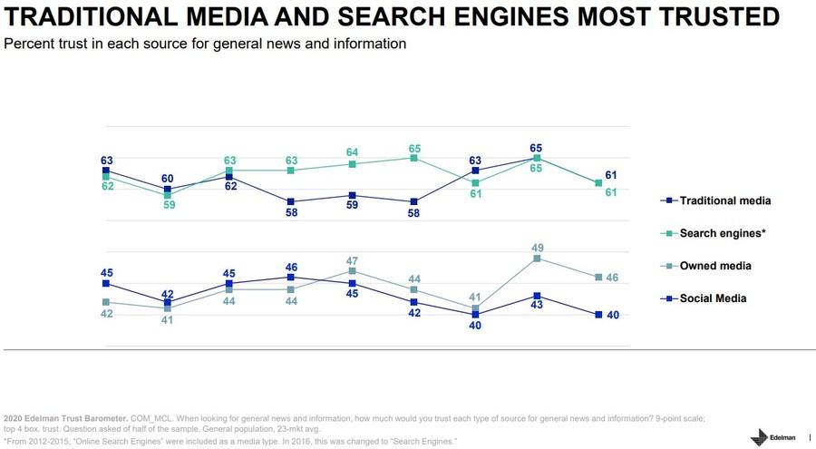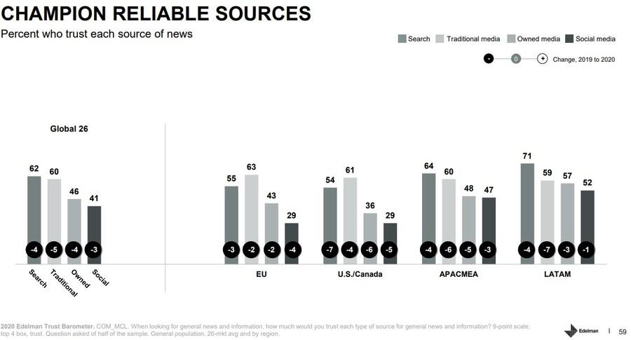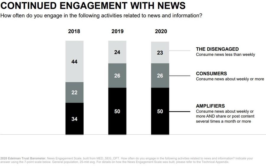 - Глобально аудитория стала чаще потреблять новости и делиться контентом в соцсетях. Тем не менее с 2019 г. уровень доверия поднялся только на 1% — до 49%, что считается недоверием к медиа.