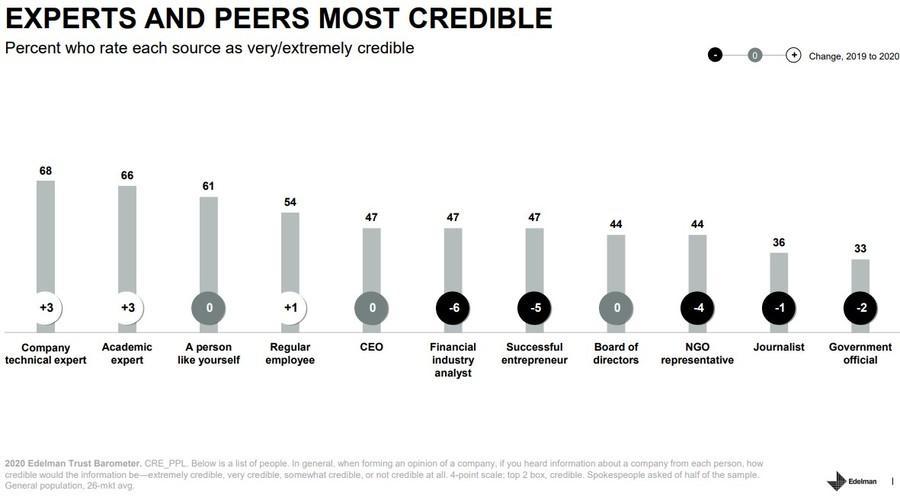 - За последний год люди стали больше доверять техническим специалистам компаний (68% опрошенных) и академикам (66%) — они возглавляют список тех, кого аудитория считает экспертами. Последние позиции в этом списке занимают журналисты (36%) и государственные служащие (33%).
