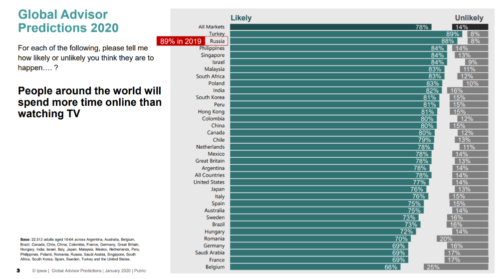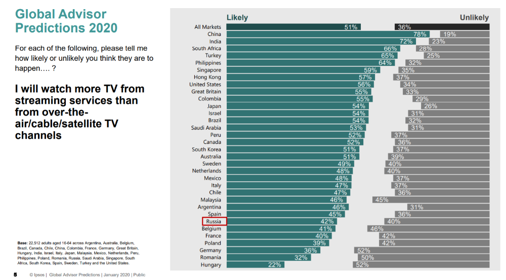Подавляющее большинство (88%) опрошенных россиян также заявили, что люди по всему миру будут проводить больше времени онлайн, чем за просмотром телевизора. При этом только 42% респондента ответили, что планируют смотреть больше ТВ-контента в стриминговых сервисах, чем через эфирное или кабельное телевидение.