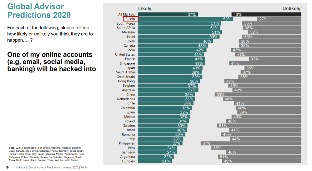Участники глобального исследования Ipsos рассказали, чего сильнее всего боятся и ждут в этом году. Выяснилось, что россияне больше, чем жители других 32 стран из опроса, опасаются взлома своих соцсетей