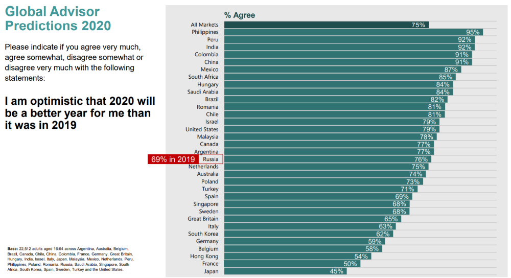 В целом в России смотрят в будущее с оптимизмом. 76% респондентов верят, что 2020-й год будет более хорошим, чем был для них 2019-й. Это оптимистичнее, чем год назад, когда улучшений в 2019-м году ждали 69% опрошенных в аналогичном исследовании.