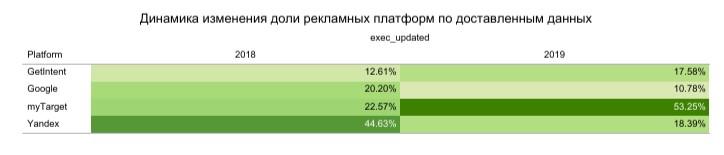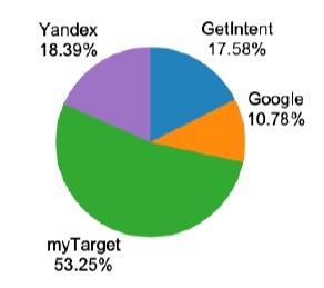 - Основными каналами монетизации аудиторных данных остаются крупнейшие рекламные платформы компаний Google, Mail.ru Group и «Яндекс», говорится в отчете CleverData и ассоциации ФинТех. По итогам 2019 г. самая большая доля доставленных данных (53,3%) пришлась на платформу myTarget. На втором месте — «Яндекс» с долей 18,4%. Тройку лидеров замкнула платформа GetIntent (17,6%), обогнав Google (10,8%). По сравнению с 2018 г. доля Mail.ru Group практически удвоилась, в то время как показатели Google и «Яндекса» снизились.