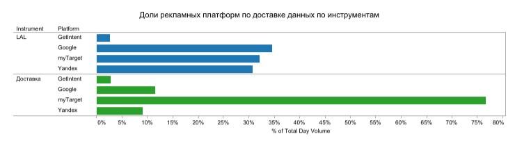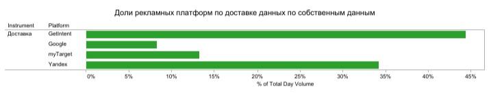 - Для получения данных внешних поставщиков (3d party data) рекламные платформы использовали разные инструменты доставки — то есть способы сбора данных, которые затем загружаются на платформу. В myTarget доставлялись преимущественно конечные сегменты — детальные аудиторные данные. Для других платформ доминировал LaL-сегмент — алгоритм поиска аудитории, похожей на релевантную. Лидерами по доставке собственных данных, или данных, принадлежащих непосредственно клиенту, являются GetIntent — с долей около 45% — и «Яндекс» (почти 35%).