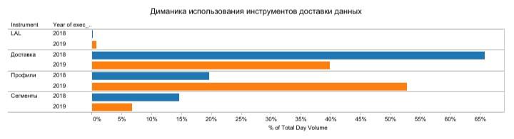 - По сравнению с 2018 г. доля использования инструмента «Профили» выросла с 20% до 53%. Иными словами, платформы стали чаще пополнять собственную аудиторию внешними данными поставщиков. Это связано с увеличением количества таких поставщиков и покупателей данных, которые работают по «устойчивым» аудиторным идентификаторам — к ним относятся, в частности, телефон и электронная почта.