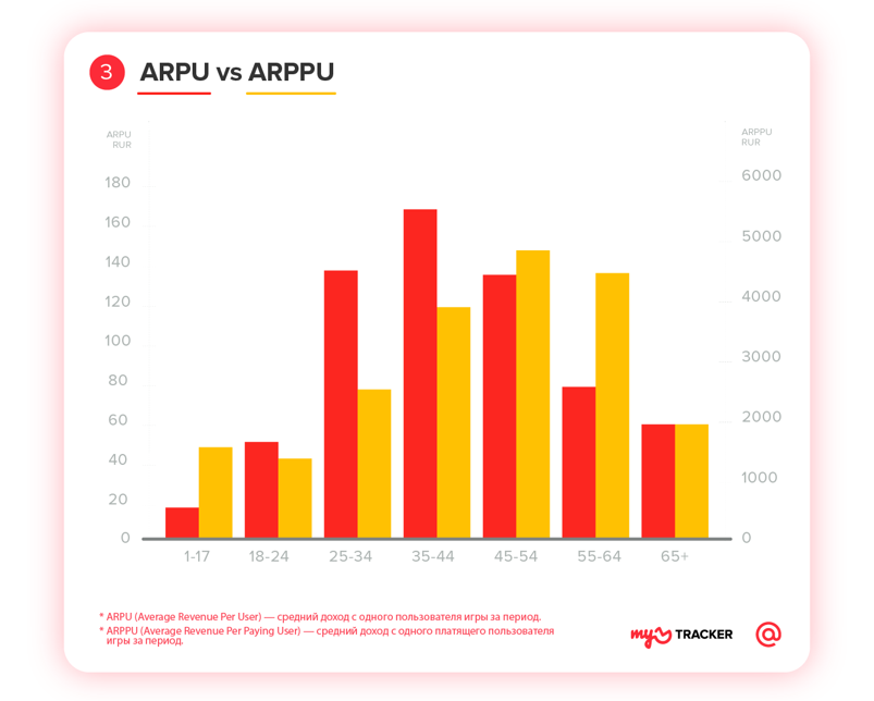 Максимальный средний доход ARPU в расчете на одного пользователя игры (как платящего, так и не платящего) приносят люди от 35 до 44 лет. При этом наибольший средний доход в расчете на платящего пользователя (ARPPU) обеспечивают геймеры в возрасте от 45 до 64 лет.