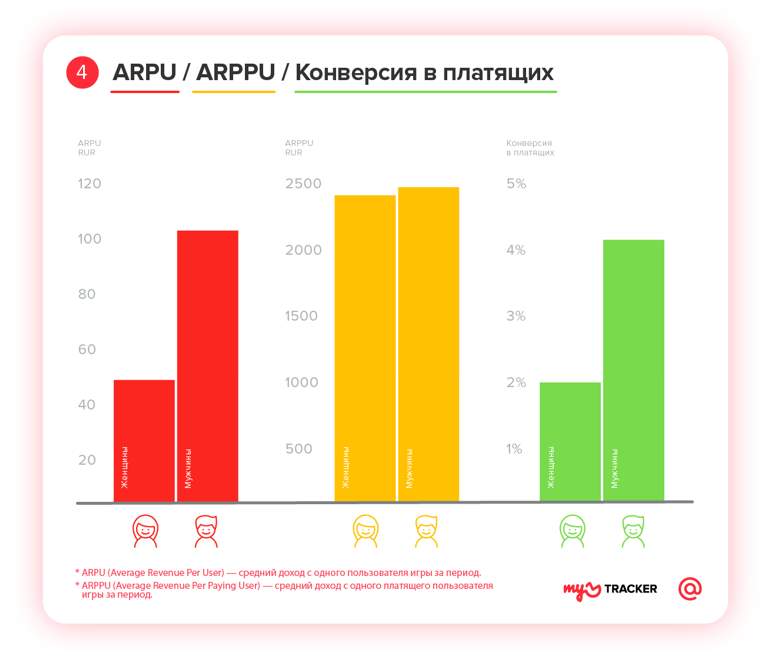 Мужчины чаще играют и лучше конвертируются в платящих пользователей, однако платящие женщины не уступают им по внутриигровым тратам. Игровые приложения в 2,6 раза чаще устанавливают мужчины — они приносят разработчикам игр в 5,5 раза больше дохода, чем женщины. Средний доход на пользователя (ARPU), который обеспечивает мужская аудитория, в два раза выше, чем ARPU женской аудитории. Однако средний доход на платящего пользователя (ARPPU) у женщин и мужчин почти не отличается.