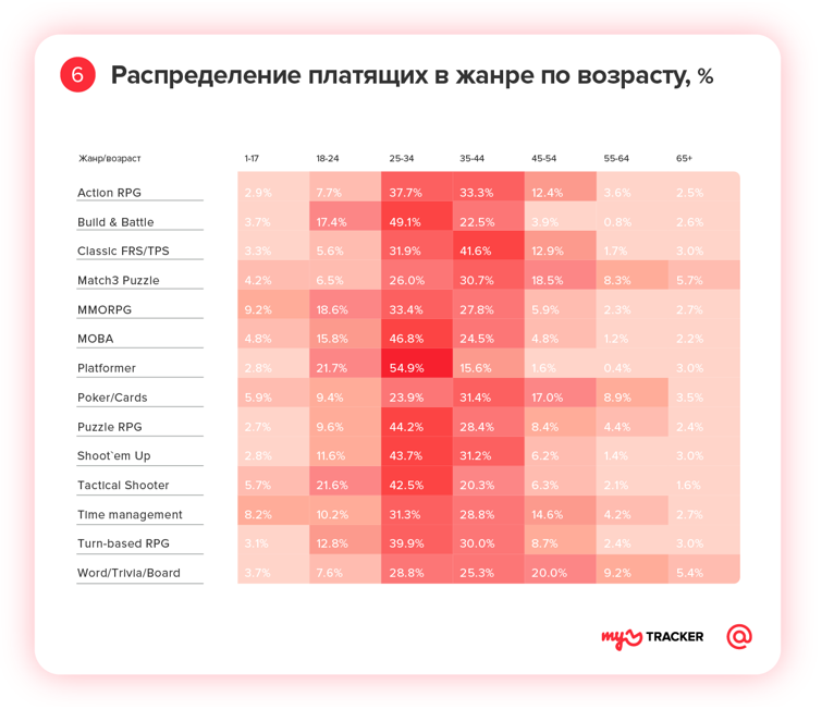 Геймеры 25–44 лет чаще всего платят в платформерах (жанр игр, в которых основной чертой процесса является прыгание по платформам, лазанье по лестницам, собирание предметов и т. д.), MOBA, играх Build & Battle. Подростки предпочитают платить в MMORPG и в играх жанра «Тайм-менеджмент», студенты — в шутерах и платформерах. В сегменте от 65 лет охотнее всего платят в кроссвордах, судоку, викторинах и в играх «Три в ряд».
