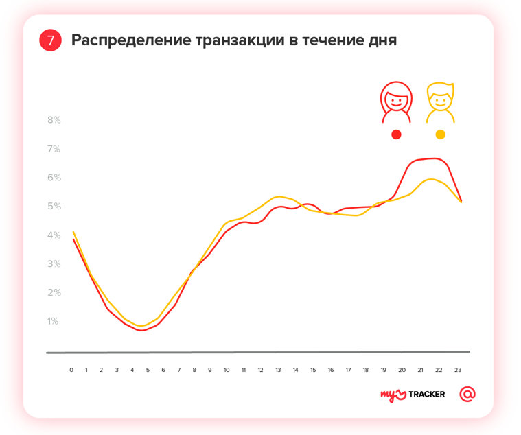 Мужчины активнее платят в обеденное время, а женщины — в вечернее. Чаще всего российские пользователи платят после 18 часов, пик приходится на 21 час. Активнее всего в вечернее время платят женщины. Еще один пик платежей — в обеденное время, около полудня.