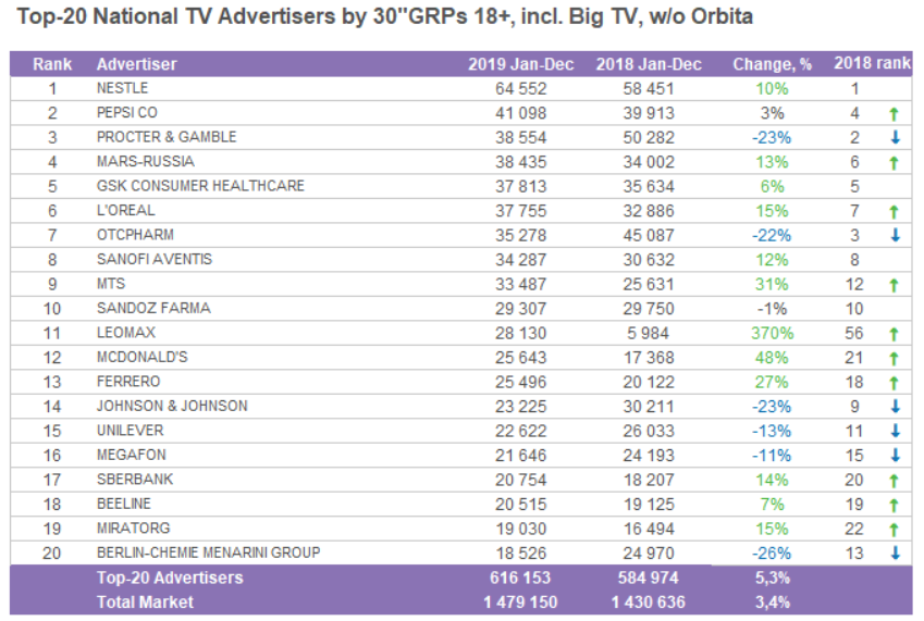 Первое место по объему закупок инвентаря по-прежнему удерживает Nestle, нарастившая присутствие на телевидении на 10% к прошлому году. Всего топ-20 рекламодателей увеличили закупки GRP на 5% при общем росте рынка в 3%, говорится в исследовании.