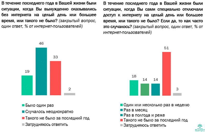 Минимум один раз в неделю от интернета отказывались 18% опрошенных. Раз в месяц перерыв делали 14% респондентов, раз в полгода и меньше — также 14%. Половина опрошенных 51% ответила, что не ограничивала себя за последний год.