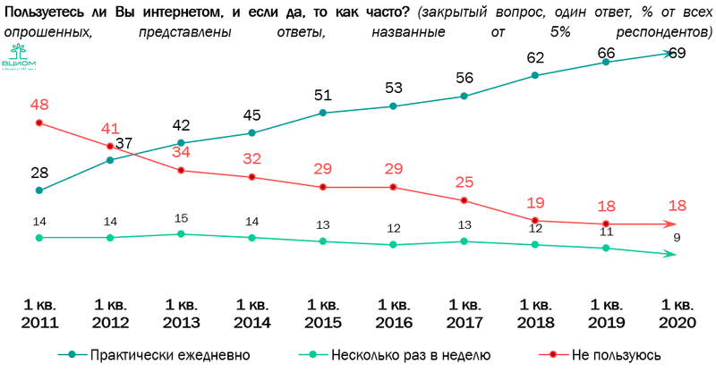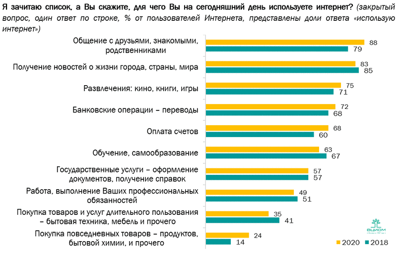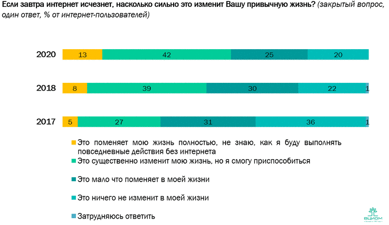 У 82% респондентов отказ от использования интернета не вызвал особенных ощущений, в появлении подавленности и тревожности признались 10%, еще 7% почувствовали радость и расслабленность.Полное исчезновение интернета в корне изменит жизнь 13% респондентов — этот показатель вырос на 8 п. п. с 2017 г. Среди молодых пользователей 18–24 лет эта доля оказалась самой высокой — 34%. 42% респондентов сообщили, отключение интернета существенно изменит их жизнь, но они смогут приспособиться, а 45% отметили, что это ничего не изменит либо мало повлияет на них — раньше доля таких пользователей составляла 67%.