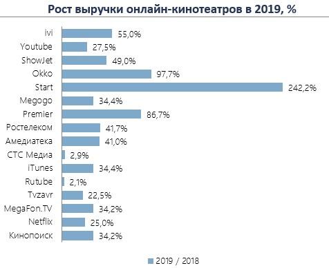 Наибольший рост доходов по сравнению с 2018 г. продемонстрировали платформа Start (242%), Оkko (97,7%), Premier (86,7%) и ivi (55%). Незначительной (менее 3%) динамика была у «СТС Медиа» и Rutube. Доля YouTube в общей выручке видеосервисов в России снижалась три года подряд: с 15% в 2017 г. до 11% в 2019 г.