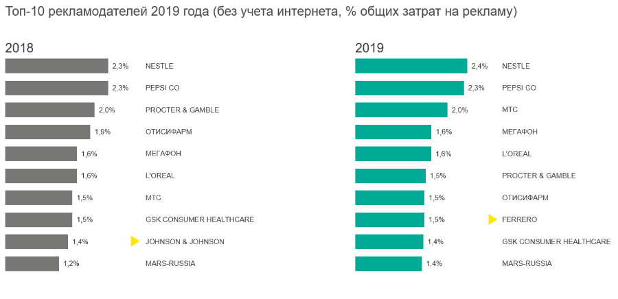 Крупнейшим рекламодателем в офлайн-медиа (без учета интернета) остается Nestle — на эту компанию в 2019 г. приходилось 2,4% от совокупного бюджета брендов на продвижение. С небольшим отставанием следует PepsiCo — 2,3%.