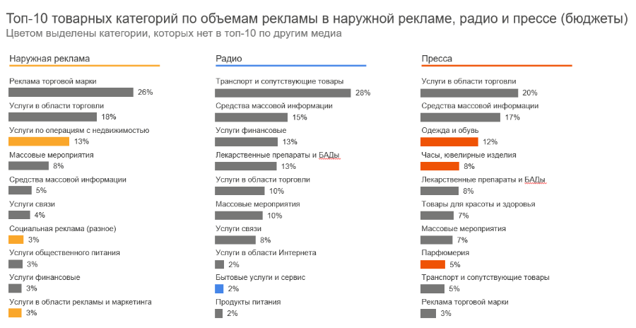 Среди товарных категорий лидеры остаются неизменными. По объему бюджетов в наружной рекламе на первое место занимает рекламаторговые марки (кобрендинг) с долей в 26%, на радио — сегмент транспорта и сопутствующих товаров (28%), в прессе — услуги в области торговли (20%).