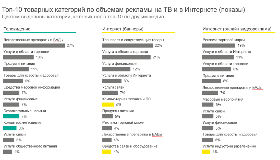 Лидером по показу баннеров в интернете остается категория транспорта и сопутствующих услуг. На первом же месте по онлайн-видеорекламе оказались торговые марки (кобрендинг), на который пришлось 19% от объема всех показов. На телевидении первое место продолжает занимать категория лекарственных препаратов и БАДов.