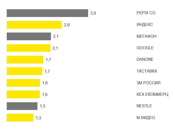 В топ-10 рекламодателей по показам в онлайн-видео первое место заняла PepsiCo. На эту компанию пришлось 3,9% всей in-stream-рекламы в стране. В 2018 г. первое место занимало онлайн-казино Azino777, не попавшее в нынешний рейтинг. Второе и третье место занимают «Яндекс» (2,6%) и «МегаФон» (2,1%).