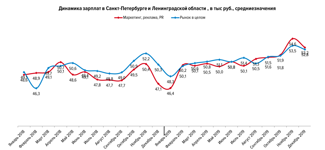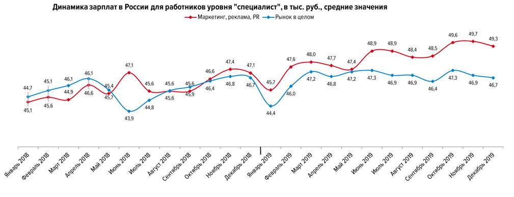 Хотя по России в целом тенденция к росту начала проявляться еще с середины 2018 г.: в июле работникам уровня «специалист» (с опытом работы до 3 лет) компании в среднем готовы были предложить 44,8 тыс. руб., работникам из профобласти маркетинга и PR — 45,6 тыс. руб. В конце 2019 г. минувшего года разрыв увеличился: показатели достигли 46,7 тыс. руб. и 49,3 тыс. руб. соответственно.
