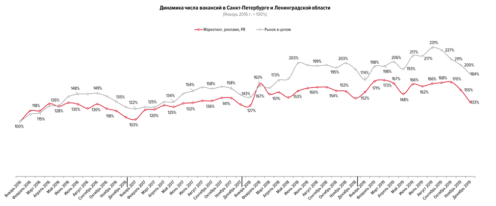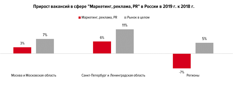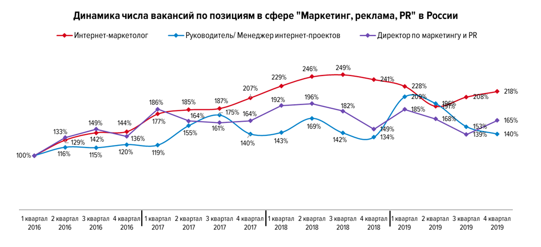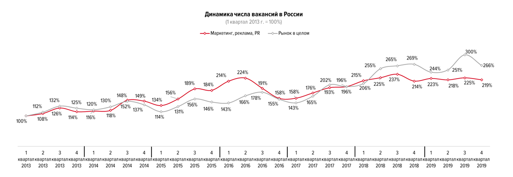 Начиная с 2018 г. темпы роста вакансий для представителей разных профобластей значительно опередили те, что отмечались в маркетинге, рекламе, PR. По сравнению с периодом с января по март 2013 г. число предложений о работе в России в период с октября по декабрь 2019 года на hh.ru выросло на 166%, прирост в сфере маркетинга составил 119%.