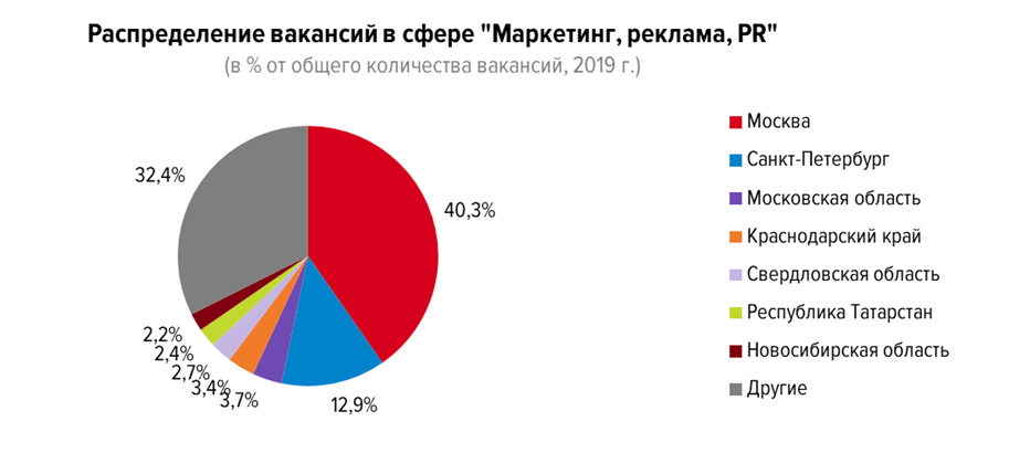 В большей степени у российских работодателей востребованы менеджеры по работе с клиентами (23% от всех специализаций в рекламе в 2019 г.), специалисты в области PR и коммуникаций (22%), интернет-маркетологи (18%), менеджеры по продвижению и ивент-менеджеры (17%), мерчендайзеры (13%) и руководители департаментов маркетинга (11%), проектные менеджеры (10%). В топе по спросу также аналитики и дизайнеры (по 9%).