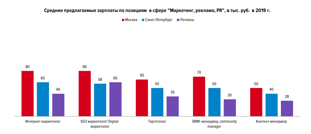 Высокая зарплатная планка у SEO-маркетологов и digital-маркетологов (от 60 до 80 тыс. руб. в зависимости от региона), а также у интернет-маркетологов (от 40 до 80 тыс. руб.). Примерно равны заработные платы в предложениях о работе для email-маркетологов (70 тыс. руб. в Москве, 57 тыс. руб. в Санкт-Петербурге и 40 тыс. руб. в регионах), таргетологов и SMM-менеджеров. Оплата труда зависит от уровня позиции специалиста, списка выполняемых задач, отрасли компании и региона. Меньший заработок указан в вакансиях для контент-менеджеров — в среднем 40–50 тыс. руб. в столице и Санкт-Петербурге, а также 28 тыс. руб. по России в целом.