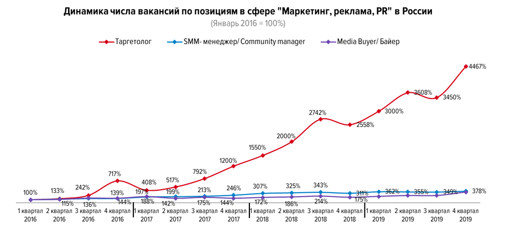 Вырос спрос на специалистов в области digital-маркетинга. Так, за три года востребованность SMM-менеджеров и медиабайеров выросла в 3,5 раза, причем число вакансий для представителей этих профессий стабильно увеличивалось от квартала к кварталу. При этом с 2017 г. резко начало расти количество предложений о работе для таргетологов. Например, во втором квартале 2017 г. прирост составил 417%, через год — во втором квартале 2018 г. — уже 1900%. В прошлом году число вакансий выросло к прошлому году на 3508%. За три года количество запросов на таргетологов увеличилось в 45 раз.