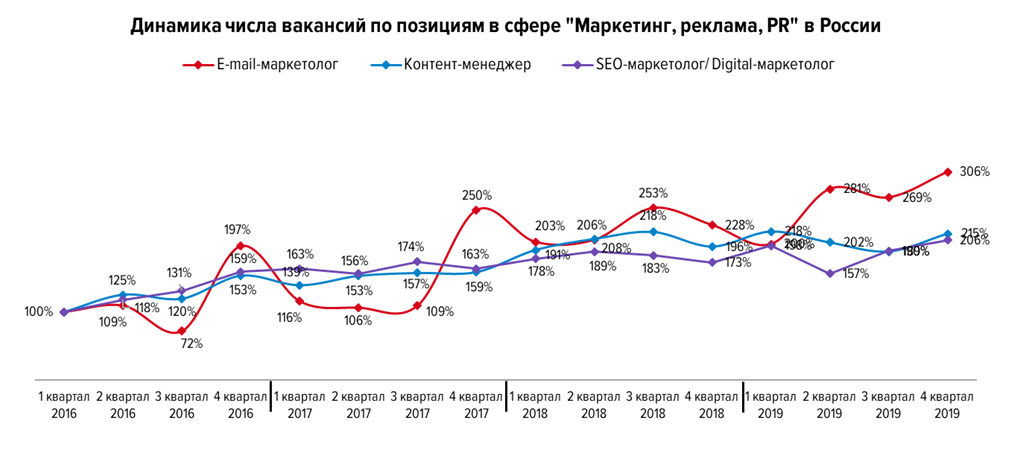 В спросе на email-маркетологов наблюдается сезонность: востребованность специалистов этого профиля увеличивается к концу года. Подобная динамика наблюдалась с 2016 по 2017 г. В 2019 г. интерес к email-маркетологам на рынке труда вырос: по сравнению с первым кварталом 2016 г. число таких вакансий поднялось на 206%.