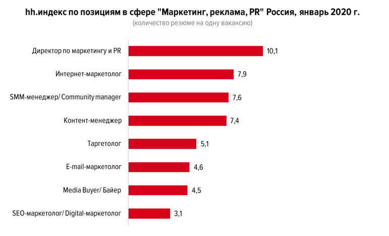 Учитывая высокий уровень заработных плат в сфере digital-маркетинга, конкуренция в этой профессиональной области увеличивается вместе с ростом спроса на специалистов. Нормой на рынке труда считается показатель, при котором на одно предложение о работе приходится 5–6 активных резюме.
