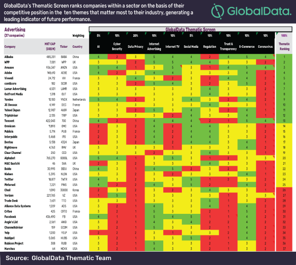 Всего GlobalData оценивает риски с учетом девяти факторов, включая защиту персональных данных, интернет-рекламу и доверие/прозрачность. Если брать только один фактор, коронавирус, то среди игроков рекламного рынка выиграют три компании — Alibaba, Amazon и Tencent, прогнозируют аналитики (индекс 4). Не почувствуют влияния Alphabet (владелец Google) и Verizon (индекс 3).
