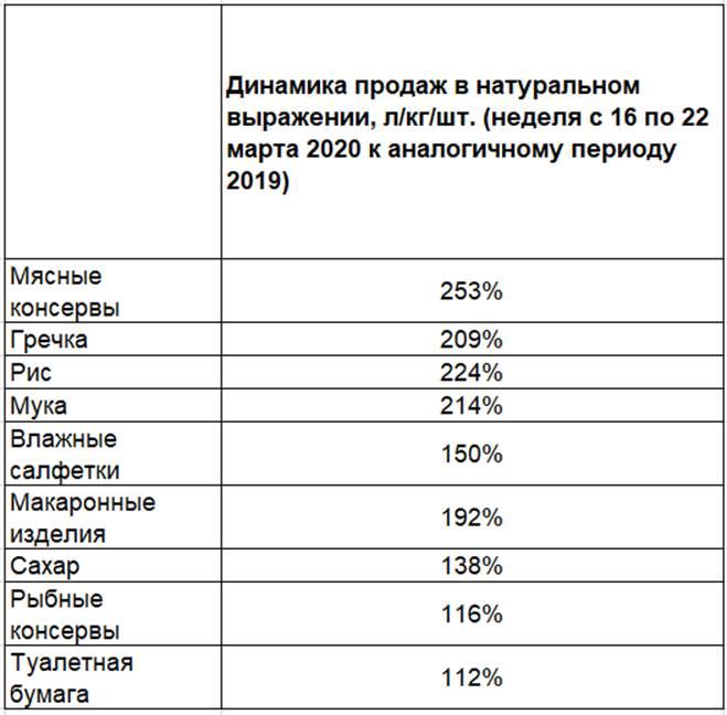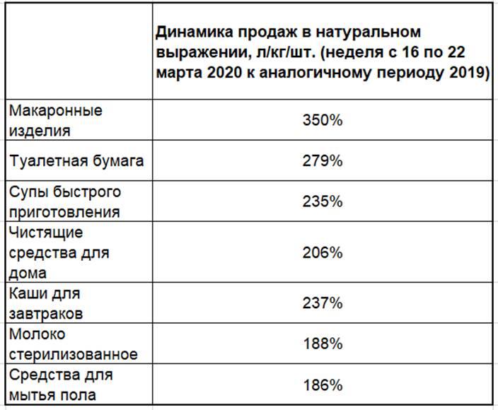 С 16 по 22 марта динамика продаж в натуральном выражении ускорилась в 2,5 раза по сравнению с предыдущей неделей и составила 35,8% (против аналогичного периода 2019 г.) — при средних значениях в 8,9% до начала ажиотажного спроса (со 2 по 11 неделю 2020 г. по сравнению с аналогичным периодом прошлого года).