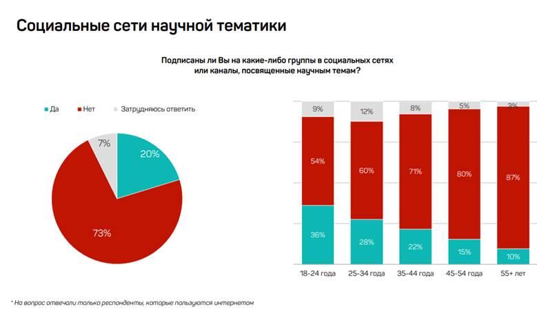 Основным источником информации о науке для россиян является интернет, причем особую роль в этом вопросе играют социальные сети. На тематические каналы и группы подписано 36% молодых людей в возрасте 18–24 лет и 28% респондентов 25–34 лет. В целом о таких подписках говорит каждый пятый пользователь.